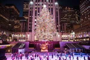 Rockefeller Center is among the most popular holiday destinations in NYC. Rockefeller Plaza boasts one of the most famous Christmas trees in the world that is lit in a grand ceremony each year. The 2024 tree, a Norway Spruce, will come from Massachusetts for the first time since 1959. The lighting ceremony will take place on December 4th during the live broadcast of Christmas at Rockefeller Center. The tree is lit daily from 5am to midnight, and on Christmas Eve, it will remain lit for 24 hours. The Rockefeller Christmas tree makes a wonderful backdrop for the ever-popular ice rink that sees nearly a quarter-million skaters each holiday season.